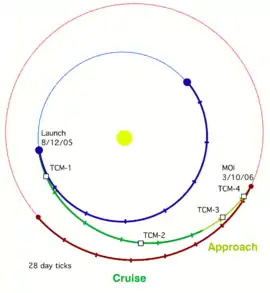 استغرقت الرحلة التي يبلغ طولها نحو 500 مليون كيلومتر إلى المريخ نحو سبعة أشهر . وقد قام مركز المتابعة الأرضي بتصحيح مسار المسبار خمسة مرات أثناء الرحلة . كان أولها تصحيح تم يوم 27 أغسطس لمدة 15 ثانية استخدمت فيها الستة محركات صاروخية بقدرة كل منها 170 نيوتن (وحدة). قبل ذلك عملت ستة محركات لمدة 30 ثانية لدفع الوقود من الخزان إلى المحركات الصاروخية الستة . عملت تلك المحاولة على زيادة سرعة المسبار بمقدار 7.8 متر في الثانية . واستخدمت في باقي التعديلات للمسار محركات أصغر تبلغ قدرة كل منها 22 نيوتن، حيث استغرقت التعديل الثاني 20 ثانية، وتم في 17 نوفمبر وزاد من سرعة المسبار بمقدار 0.75 متر في الثانية . وكان من المخطط له أن يتم التعديل الثالث نحو 40 يوما قبل الوصول إلا أن هذا التعديل لم يكن لازما إذا كان مسار المسبار على أحسن ما يكون .
