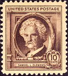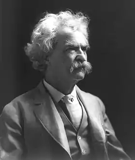 مارك توين (بالإنجليزية: Mark Twain) واسمه الحقيقي "صمويل لانغهورن كليمنس" (بالإنجليزية: Samuel Langhorne Clemens) هو كاتب أمريكي ساخر (30 نوفمبر 1835 ـ 21 أبريل 1910)[3] عرف برواياته مغامرات هكلبيري فين (1884) التي وصفت بأنها "الرواية الأمريكية العظيمة"[4] ومغامرات توم سوير (1876). وقد نقلت عنه الكثير من الأقوال المأثورة والساخرة[5][6]، وكان صديقاً للعديد من الرؤساء والفنانين ورجال الصناعة وأفراد الأسر المالكة الأوروبية، ووصف بعد وفاته بأنه "أعظم الساخرين الأمريكيين في عصره"[7]، كما لقبه وليم فوكنر بأبي الأدب الأمريكي.[8]