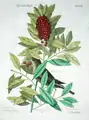 Coccothraustes rubra (يُحتمل أنه الكردينال الشمالي) بالإضافة إلى Nux Juglans alba Virginiensis, 1754