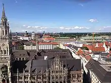 في العصور الوسطى كانت الأسواق و البطولات تقام في ساحة المدينة. مارين بلاتز سميت بذلك بعد المارين زولي (Mariensäule)، وهو النصب الذي شيد في مركزها في عام 1638 للاحتفال بانتهاء الاحتلال السويدي. اليوم المارين بلاتز يسيطر عليه من قبل مجلس المدينة الجديد (New City Hall -Neues Rathaus-) في الجهة الشمالية. الجلوكنسبل (Glockenspiel) في برج مركز المدينة الجديد تم استلهامه من هذه البطولات، وهو يستقطب ملايين السياح سنويا. في الجزء الشرقي تقع ساحة المدينة القديمة لميونخ (ألتيس ريثس - Altes Rathaus). هي عبارة عن ساحة وصالة وبرج المجلس القوطي، والذي تم إعادة بناؤه. المنطقة المخصصة للمشاة بين كارلز بلاتز (Karlsplatz) و مارين بلاتز (Marienplatz) هي منطقة مزدحمة بالعديد من المحلات والمطاعم. المحطات مارين بلاتز(Marienplatz)، اس باهن (S-Bahn)، و يو باهن (U-Bahn) هي مراكز مهمة للنقل تقع تحت الميدان.