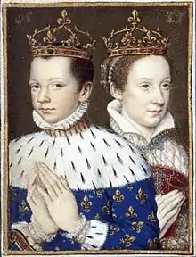 في 10 يوليو 1559 توفي هنري الثاني متأثرا بجراحه التي أصيب بها في منافسة مجاولة، بعدها أصبح فرنسوا البالغ من العمر خمسة عشر عاما وماري البالغ من العمر ستة عشر عاما ملكا وملكة لفرنسا.[56] وأصبح اثنان من أخوال الملكة مرشحين في السياسة الفرنسية،[57] دوق غيس وتشارلز، كاردينال لورين [الإنجليزية]، يستمتعان بسيطرة يسميها بعض المؤرخين، (الاستبداد الغويزي (بالفرنسية: la tyrannie Guisienne)).[58]