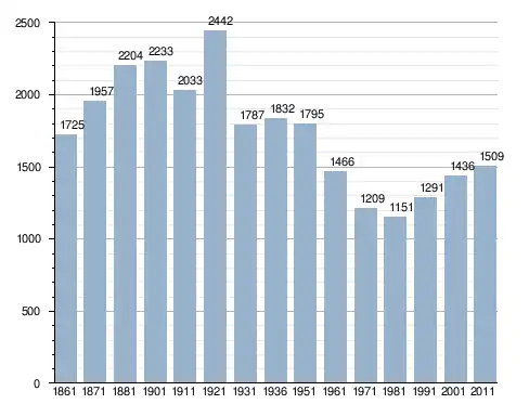 في سنة 1861 بلغ عدد السكان 1٬725 نسمة، وتطور العدد ليصل في سنة 2011 لـ 1٬509 نسمة.