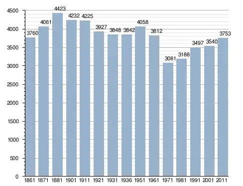 في سنة 1861 بلغ عدد السكان 3٬760 نسمة، وتطور العدد ليصل في سنة 2011 لـ 3٬753 نسمة.