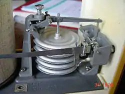 - Indicator needle axle. This has a spur gear that engages the sector gear (7) and extends through the face to drive the indicator needle. Due to the short distance between the lever arm link boss and the pivot pin and the difference between the effective radius of the sector gear and that of the spur gear, any motion of the Bourdon tube is greatly amplified. A small motion of the tube results in a large motion of the indicator needle.