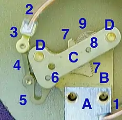 - A: Receiver block. This joins the inlet pipe to the fixed end of the Bourdon tube (1) and secures the chassis plate (B). The two holes receive screws that secure the case.