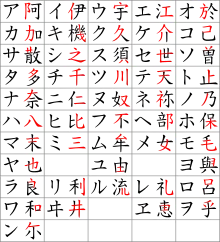 جدول يوضح حروف الكاتاكانا مع أصلها من حروف مانيوغانا.