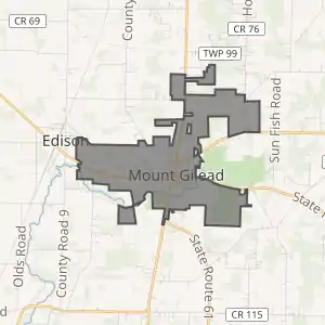 - "صفحة ماونت غيلاد (أوهايو) في خريطة الشارع المفتوحة". OpenStreetMap. اطلع عليه بتاريخ 5 مارس 2021. الوسيط