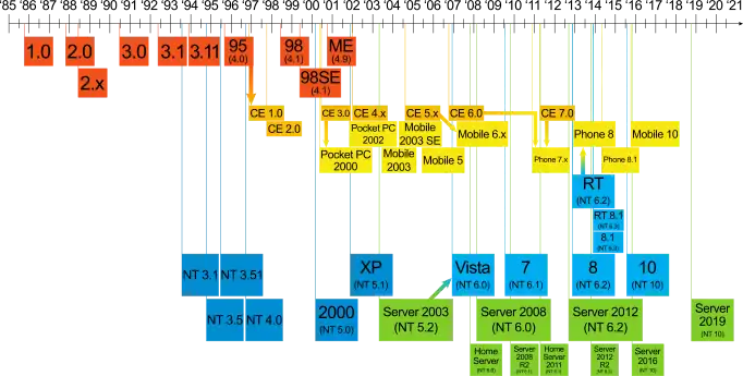 أحدث إصدار من ويندوز هو ويندوز 10، وأحدث نظام للهواتف هو ويندوز فون 10، وأحدث إصدار للخوادم هو ويندوز سيرفر 2018.