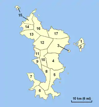 تقسم مايوطة إلى 17 وحدة إدارية. كما يوجد 19 إقليم (لم يشر إليها هنا) كل منها ترتبط بواحدة من الوحدات الإدارية، عدا مامودزد التي تقسم إلى ثلاثة أقاليم. ولا يوجد دوائر إدارية فرنسية في الجزيرة.
