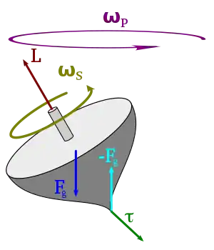 في الشكل يدور قرص الجيروسكوب حول محوره بسرعة تكون في العادة عالية ، والمبادرة هي حركة دوران المحور ذاته حول محور آخر غير مرئي رأسي ، في هذا الشكل موازي لجاذبية الأرض .
