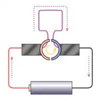 - أمَّا في المولد :- يحافظ عزم الدوران الميكانيكي المطبق على العمود على حركة دوران المحرك المتعرج عبر المجال المغناطيسي الثابت، مما يؤدي إلى حدوث تيار في اللف. في كل من علبة المحرك والمولد ، يقوم العاكس بتغيير اتجاه التدفق الحالي بشكل دوري خلال اللف بحيث يستمر التدفق الحالي في الدائرة الخارجية للماكينة في اتجاه واحد فقط.