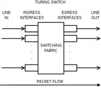 يتكون مُبدل تورنغ من نسيج تبديل، وواجهة واحدة أو أكثر للإدخال (يشار إليها أيضًا بالمصادر) وواجهة أو أكثر للإخراج (أحواض) وإجراء تقريري لتحديد واجهة الإدخال الخاصة بواجهة الإخراج. وفي بعض الأحيان يشار للواجهات بالمنافذ. يصل الطرد (الخلية أو الوحدة المُحولة) إلى واجهة الإدخال، فيقوم الإجراء التقريري بتحديد واجهة الإخراج المناسبة، فيتم نقل الطرد عبر نسيج التبديل إلى واجهة الإخراج. والطرد عبارة عن رمز أو سلسلة من 1 و0. وتتصل واجهة الإدخال بخط الإدخال، وواجهة الإخراج بخط الإخراج. ويُقال إن خط الإدخال يغذي واجهة الإدخال؛ وواجهة الإخراج تغذي خط الإخراج.[1]