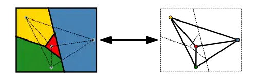 مبرهنة الألوان الأربعة تنص على أنه يمكن لأي مستوى مقسّم إلى عدّة مناطق أن يلّون فقط بأربعة ألوان على أكثر تقدير, بحيث لا تلون منطقتان متجاورتان (لهما نفس الحدود) بنفس اللون، إلا في حالة تشاركهما في نقطة واحدة.[1][2][3]