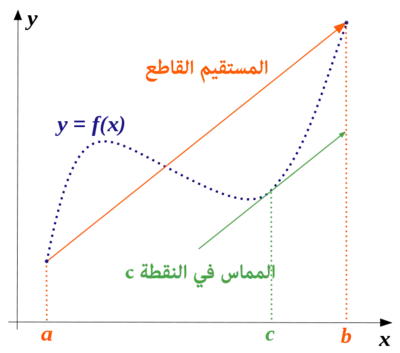 النص : لتكن f دالة عددية f : [a, b] → ℝ بحيث a <b، إذا كانت f متصلة على المجال المغلق [a, b] وقابلة للاشتقاق على المجال المفتوح ]a, b[، فإنه يوجد على الأقل عدد حقيقي c ينتمي للمجال ]a, b[ بحيث :