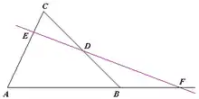 مبرهنة مينلاوس، الحالة الأولى: يمر المستقيم DEF داخل المثلث ABC.
