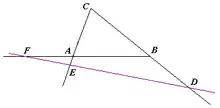 مبرهنة مينلاوس، الحالة الأولى: المستقيم DEF هو بالكامل خارج المثلث ABC.
