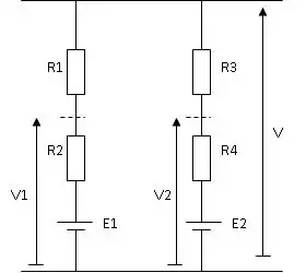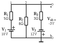 في حالة مولدات الجهد غير المثالية (أنظر الشكل جنبه)، تضاف المقاومات الداخلية لكل مولد إلى مقاومة الفرع.