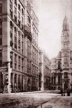 وفي عام 1882م، بدأ تشييد مبنى مجلس شيكاغو للتجارة في مقره الجديد الذي افتُتح في موقعه الحالي يوم 1 مايو 1885م. وهذا المبنى صُمم على يد المهندس وليم بوينجتون المشهور هذه الأيام بإنجازه الرائع في بناء برج مياه شيكاغو الذي يقع على واجهة شارع جاكسون ستريت والذي يرتفع 188 قدم (55مترًا)، كما بُني من هياكل الحديد الصلب والجرانيت الذي استُخرج من محجر جزيرة فوكس بالقرب من مدينة فينالهافن بولاية ماني. وبُني أيضًا الجزء الخلفي للمبنى من الطوب المصقول، وهذا المبنى يحتوي على عشر طوابق فيظهر على شكل برج شاهق يبلغ ارتفاعه 320 قدم(98 مترًا)، كما يحتوي على ساعة كبيرة وجرس لا يقل وزنه عن 2000 كيلوجرام ولا يقل ثمنه عن 4500 جنيه. بالإضافة إلى وجود طاحونة هواء مصنوعة من النحاس على قمته، وهذه الطاحونة على شكل سفينة يبلغ عرضها 9 أقدام (27 مترًا). وكان تشطيب الأجزاء الداخلية من الماهوغنى والفورسكود. لذلك بلغت تكلفة تشييد المبنى 1,8 مليون دولار إلى جانب 47 مليون دولار في عام 2013م. وكان هذا المبنى أول مبنى تجاريًا في شيكاغو يُدار بالمصابيح الكهربائية، إلى جانب احتوائه على أربعة مصاعد وقاعة رئيسة مُشيدة على نطاق واسع يبلغ ابعادها 152 قدم (46 مترًا)× 161 قدم (49 مترًا) و80 قدمًا (24 مترًا) مع الديكورات الفخمة من الزجاج الملون الذي ينعكس عليه ضوء السماء، بالإضافة إلى درابزين[10] منقوش بالأحجار المُزَخرِفة.[11] كما تخطى ارتفاعه 300 قدم (91 مترًا) فكان أطول مبنى في شيكاغو في هذا الوقت. وعُقدت الاحتفالات والمراسم بهذا المبنى في اليوم التاسع والعشرين من إبريل عام 1885م، كما وُصفت هذه الاحتفالات بأنها متألقة وجليلة حيث حضرها أكثر من أربع مائة ألف شخص من أصحاب المقامات الرفيعة والمكانات المرموقة على مستوى العالم.[11]