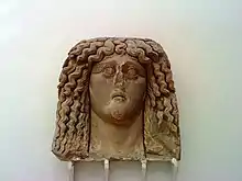 - رأس امرأة ضخم شعرها طويل وغزير يشبه الأفاعي.هناك تشوهات وكسر طفيف في الوجه والشعر.