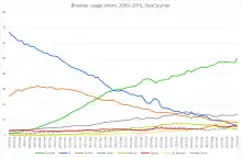 مايكروسوفت (Microsoft) مع متصفح إنترنت إكسبلورر (Internet Explorer) في عام 1995، التي بدأت صناعة حرب المتصفحات(Browser wars). عن طريق إنترنت إكسبلورر مع ويندوز مايكروسوفت كانت قادره على فرض هيمنتها على السوق في نظام تشغيل (OS) لتستولي على سوق متصفحات الإنترنت، إنترنت إكسبلورر بلغت ذروتها بأكثر من من 95% بحلول عام 2002. متصفح إنترنت إكسبلورر يستخدم 65% في أكتوبر 2009 وفقا لتطبيقات الشبكة.
