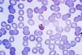 ![]() صورة مجهرية موضحة بصبغة جيمسا لمتصورة وبالية بالغة متقسمة. | |
