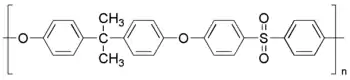 - n HOC6H4OH + n (ClC6H4)2SO2 + n Na2CO3 → [OC6H4OC6H4SO2C6H4]n + 2n NaCl + n H2O + n CO2