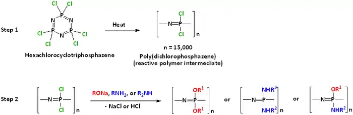 تحضر أغلب متعددات الفوسفاوين الخطية بعملية ذات مرحلتين،[1][2][3][4] وذلك انطلاقاً من مركب سداسي كلورو الفوسفازين بتسخينه بمعزل عن الهواء إلى درجات حرارة تتراوح حوالي 250 °س، مما يؤدي إلى فتح الحلقة وتشكيل وحدات متكررة. في الخطوة الثانية يتم التفاعل مع مركبات عضوية مثل مركبات الألكوكسيد أو الفينولات أو الأمينات أو مركبات عضوية فلزية مختلفة، حيث يحدث تفاعل استبدال مع ذرات الكلور على السلسلة مما يؤدي إلى الحصول على البوليمير الموافق.[6]