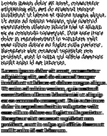 - الكتابة: ويكتب تصاعديا أو تنازليا (بشكل مائل)، وتكون الفراغات بين الكلمات أو الأسطر وحتى الحروف في الكلمة الواحدة غير متساوية، ولا يستطيع ترتيب الأرقام بشكل أعمدة صحيحة.