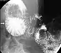 سلسلة الجهاز الهضمي العلوي توضح تمدد عرض الإثناعشرية المدقع (السهم الأبيض) قبل انقباض مفاجئ من قبل سعد.