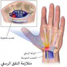 |CitationClass=تم تجاهله (مساعدة) - "Carpal Tunnel Syndrome Information Page". المعهد الوطني للاضطرابات العصبية والسكتة الدماغية. 28 ديسمبر 2010. مؤرشف من الأصل في 02 ديسمبر 2016. الوسيط