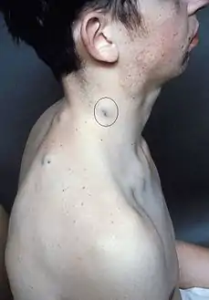 ![]() التشوهات الوريدية الجلدية في متلازمة الوحمة الزرقاء المطاطية الفقاعية. التشوهات الوريدية الجلدية في متلازمة الوحمة الزرقاء المطاطية الفقاعية. | |