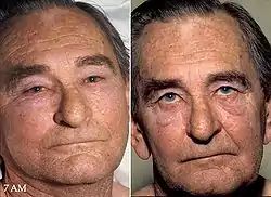 ![]() متلازمة الوريد الأجوف العلوي في شخص مصاب بسرطان القصبية . يلاحظ تورم الوجهه في الصباح (إلى اليسار) وبعدها يستقيم الوجه طوال اليوم (يمين). . متلازمة الوريد الأجوف العلوي في شخص مصاب بسرطان القصبية . يلاحظ تورم الوجهه في الصباح (إلى اليسار) وبعدها يستقيم الوجه طوال اليوم (يمين). . | |