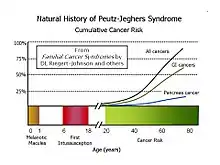 تشمل المخاطر المرتبطة بهذه المتلازمة التوجه القوي لحدوث سرطان في عدة أجزاء في الجسم.[4] ففي حين لا تملك السلائل الورمية العابية سوى فرصة ضئيلة للتحول إلى ورم خبيث (<3%)، يمتلك مرضى المتلازمة نسبة خطورة أعلى للإصابة بسرطانات البنكرياس،[5] والكبد، والرئة، والثدي، والمبيض، والرحم، والخصية، وغيرها من الأعضاء. على وجه الخصوص، ترتبط المتلازمة بخطورة أكبر للإصابة بأورام معينة في المبيض.