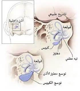 ![]() تمتلك القوقعة بشكل طبيعي لفتين ونصف اللفة ولكن في حالة متلازمة بيندريد قد تمتلك لفة ونصف فقط نتيجة اتساع كيس الليمف الباطني بشكل غير طبيعي . تمتلك القوقعة بشكل طبيعي لفتين ونصف اللفة ولكن في حالة متلازمة بيندريد قد تمتلك لفة ونصف فقط نتيجة اتساع كيس الليمف الباطني بشكل غير طبيعي . | |