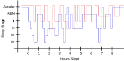 ![]() Sleep pattern of a restless legs syndrome patient (red) vs. a healthy sleep pattern (blue). Sleep pattern of a restless legs syndrome patient (red) vs. a healthy sleep pattern (blue). | |