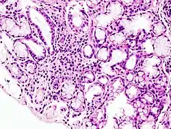 ![]() صورة نسيجية مرضية لارتشاح لمفاوي بؤري في غدة لعابية صغيرة مصحوبا بمتلازمة شوغرن، خزعة للشفة، صبغة H & E صورة نسيجية مرضية لارتشاح لمفاوي بؤري في غدة لعابية صغيرة مصحوبا بمتلازمة شوغرن، خزعة للشفة، صبغة H & E | |