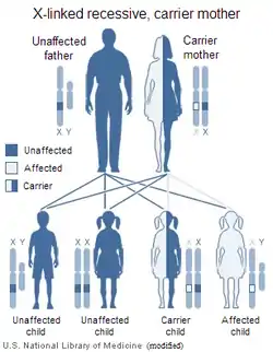 - الأم التي تحمل هذا الخلل تنقله في المتوسط إلى 50 ٪ من أطفالها، سواء س س أو س ص. الذين يحملون هيئة س ص ص، يكونون بالمثل ناقلين غير متأثرين، الذين بإمكانهم نقله إلى الأجيال المقبلة. أولئك الذين لهم هيئة س ص، يملكون شروط النقل ،ولكن بما أنهم مصابون بالعقم، لن يمكنهم من تمرير تمريره.