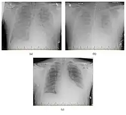 ![]() صورةُ أشعة تظهر التطور الرئوي الحاصل في متلازمة فيروس هانتا. تُمثل (a) الصورة عن ظهور الأعراض لأول مرة، (b) صورة في اليوم الثاني من الدخول إلى المستشفى وبعد الأكسجة الغشائية خارج الجسم، (c) صورة في اليوم العاشر من الدخول إلى المستشفى وذلك بعد تركيب أنبوبٍ للشخص صورةُ أشعة تظهر التطور الرئوي الحاصل في متلازمة فيروس هانتا. تُمثل (a) الصورة عن ظهور الأعراض لأول مرة، (b) صورة في اليوم الثاني من الدخول إلى المستشفى وبعد الأكسجة الغشائية خارج الجسم، (c) صورة في اليوم العاشر من الدخول إلى المستشفى وذلك بعد تركيب أنبوبٍ للشخص | |