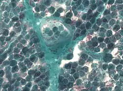 ![]() ملاحظة العديد من الألياف الحمراء الخشنة في خلال فحص للعضلات بالمجهر ملاحظة العديد من الألياف الحمراء الخشنة في خلال فحص للعضلات بالمجهر | |