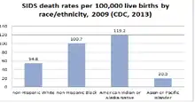 في عام 2013، كانت هناك تفاوتات مستمرة في وفيات متلازمة موت الرضيع الفجائي بين المجموعات العرقية والإثنية في الولايات المتحدة. وفي عام 2009، تراوحت معدلات الوفاة من 20.3 لكل 100,000 ولادة حية لآسيا / جزر المحيط الهادئ إلى 119.2 لكل 100,000 ولادة حية للهنود الأمريكيين / سكان ألاسكا الأصليين. ويعاني الأطفال الأمريكيون من أصل أفريقي من خطر أكبر بـ 24٪ من الوفاة المرتبطة بـالمتلازمة.[77] ويزيد عدد الحالات بنسبة 2.5٪ عن الرضع القوقازيين.[78]