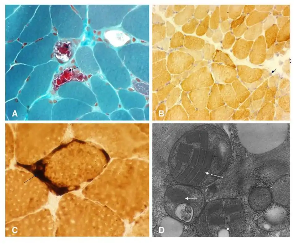 - أخذ عينة من العضلات : تظهر ألياف حمراء رقيقة.
