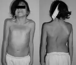![]() طفلة عمرها 12 سنة مصابة بمتلازمة نونان. يلاحظ انحناء مزدوج للهيكل العظمي العلوي مع الضلع . طفلة عمرها 12 سنة مصابة بمتلازمة نونان. يلاحظ انحناء مزدوج للهيكل العظمي العلوي مع الضلع . | |