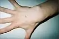 يد مريض ذا 37 عام تظهر تشابكات ما بين الأصابع الجلدية