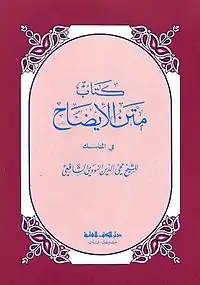 كتاب متن الإيضاح في المناسك مؤلفه الإمام يحيى بن شرف النووي الدمشقي، و يتحدث عن أحكام ومناسك الحج الذي هو الركن الخامس للدين ، كما يذكر مصححاته ومفسداته وواجباته وآدابه ومسنوناته وسوابقه ولواحقه وظواهره ودقائقه، وما يتعلق بهما من الأحكام، وما تميزت به عن سائر الإسلام ، وبيان الحرم ومكة والمسجد والكعبة ووتميزهم، فجاء الكتاب في 8 أبواب و3 فصول.[1]