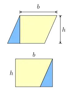 تحسب مساحة متوازي أضلاع بمعرفة طولي القاعدة والارتفاع بالقانون: حيث b طول القاعدة، وهي أي ضلع في متوازي الأضلاع، وh الارتفاع وهو العمود النازل من الرأس المقابلة لذاك الضلع عليه.