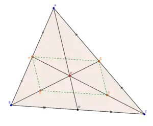 الرباعي FEGH فيه ضلعان EF و GH متوزايان حيث يوازي كل منهما BC، ومتطابقان حيث يساوي كل منهما نصف BC.