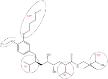 مثال على الارتباط بمثبط الرينين: أليسكيرين هو مثبط رينين شبيه للبيبتايد وعلى عكس الغالبية فهو محب للماء. يثبط القدرة التنشيطية للإنزيم من خلال احتلال الجيوب من S3 إلى S2` ما عدا الجيب S2. يرتبط أليسكيرين أيضا بالجييب S3sp و لأن الجيب انتقائي للرينين. لا يثبط أليسكيرين أسبارتيك بروتيازات أخرى مثل الكاثبسين D (cathepsin d) و البيبسين (pepsin).[39] ترتبط السلسلة الطرفية للأليسكيرين بالجييب S3sp بمثالية و يؤدي إلى فعاليته كمثبط للرينين في الإنسان.[6] تشكل مجموعة الهايدروكسيل للأليسكيرين رابطة هيدروجينية مع كلا الأكسجين وال Asp32. مجموعة الأمين تشكل رابطة هايدروجينية مع مجموعة حمض الكاربوكسيل لل Gly217 و ذرة الأكسجين من الAsp32. تملأ مجموعة الميثوكسي على الحلقة الأروماتيكية الجيب S3 و يمكن أن تشكل رابطة هيدروجينية مع مجموعة أمين ثانوية من Tyr14. تشكل مجموعة الأميد رابطة هيدروجينية مع مجموعة الأمين الثانوية لل Ser79.[37] يتم احتلال الجيبين S1 و S1` من قبل مجموعتي بروبيل على الموقعين P1 و P1`.[36] موقع الأميد الطرفي في P2` يثبت ذيل الأميد في الموقع الفعال عن طريق تكوين رابطة هايدروجينية مع Arg74 في الجيب S2`.[40]