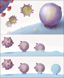 فيروس العوز المناعي البشري يرتبط بخلية بشرية تحتوي على كتلة التمايز 4. الصورتان في الأسفل توضح النماذج المحتملة لطريقة دخول الفيروس للخلية.