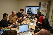 - الناشطون: وهي مجموع إداريي ومحرري الموسوعة الذين يعتمدون أدوات الويكيميديا في التواصل مثل صفحات نقاش المقالات وصفحات نقاش المستخدم.