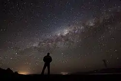 يبلغ قطر درب التبانة حوالي 100 ألف سنة ضوئية،[70][71]، وفيها ما يربو على مائتي مليار نجم،[72] ومتوسط المسافة بين كل نجم وآخر خمس سنوات ضوئية، وتستغرق الشمس التي تبعد حوالي 30 ألف سنة ضوئية عن المركز[73] قرابة 250 مليون سنة مما نعُد لكي تكمل دورة واحدة حولها.[74]